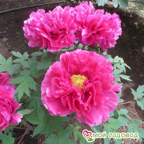 Один из лучших красных сортов пионов. Цветки полумахровые диаметром 20-25 см. Окраска цветка яркая розово-красная, центр жёлтый. Лепестки блестящие, гофрированные. Верхняя часть лепестков в процессе цветения становится красновато-фиолетовой. Куст высотой 120-150 см. Побеги сильные, вертикальные. Аромат лёгкий, пряный. Цветение обильное с мая по июнь. На одном кусте может быть от 30 до 70 цветков. Пион древовидный — морозоустойчивый кустарник, достигающий высоты до 2 м, с крупными ярко-зелеными листьями. На одном кусте может быть от 30 до 70 цветков. Диаметр каждого от 20 до 25 см. Продолжительность цветения 12—14 дней. Растение декоративно и после цветения из-за необычной формы листьев. Пион неприхотлив, устойчив к болезням. На одном месте без пересадки может расти более 20 лет. Место посадки Для посадки пионов понадобится защищенное от ветров место с хорошей освещенностью. Сорта светлой окраски, а также пионы с простыми и полумахровыми цветками можно посадить на частично затеняемом участке, это продлит цветение и защитит цветы от выгорания. ХРАНЕНИЕ ДО ПОСАДКИ: После получения посылки, рекомендуем вскрыть пакет и осмотреть корневище. Почки должны быть плотные и розового цвета. Так же уделите внимание самому корневищу, все сомнительные, потемневшие, сморщенные части удалите, а места среза обработайте зеленкой или залой. Если почки еще не тронулись в рост, а высаживать в открытый почву рано, советуем Вам хранить корневище в холодильнике, обязательно оставляя его в пакете с торфяной смесью или в коробке под снегом. Если почки успели раскрыться это не критично, сохранить до посадки их так же возможно, высадите корень пиона в большой просторный горшок или в любую другую ёмкость.